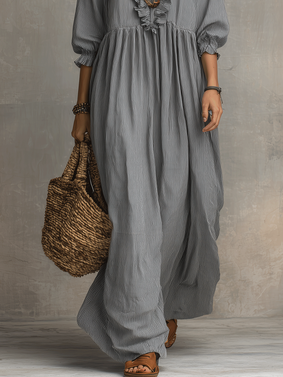 La ropa larga bohemia fluida con acabados de volantes es una pieza llena de encanto que combina elegancia y espíritu bohemio. Con sus delicados volantes y su silueta fluida, se presenta como una elección ideal tanto para días casuales como para ocasiones más especiales. Su diseño trabajado y su bonito caimiento ofrecen un equilibrio perfecto entre comodidad y feminidad.